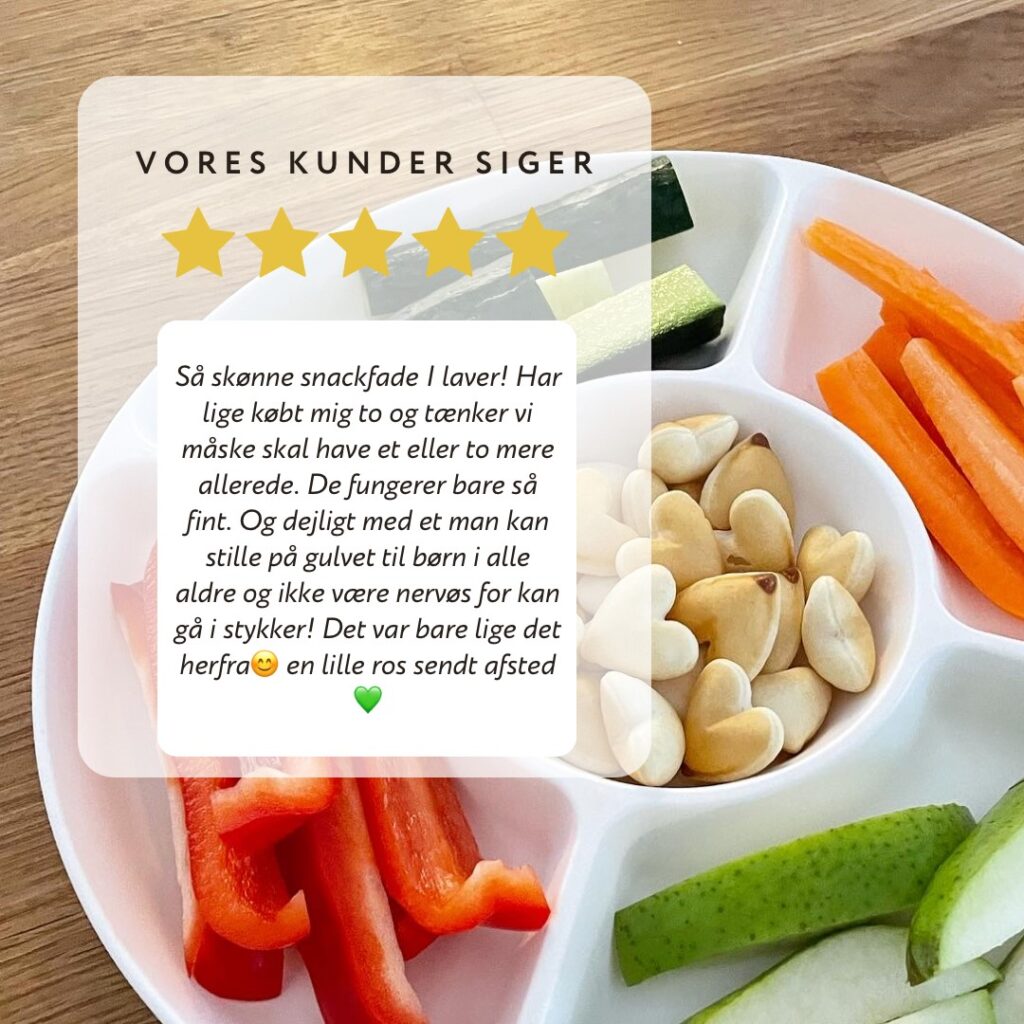 Valget på opdelingen med fem rum er truffet ud fra, at det skal være let at fylde fadet. Hvis der er for mange rum, og man ikke synes, man har nok forskelligt at komme deri, vil man måske ikke så ofte bruge snackfadet. Og vores ønske er, at det bliver et fad, som bliver brugt hver dag. Rummene er fordelt symmetrisk omkring cirklen, hvilket gør, at man kan fylde det samme i to rum uden at det ser forkert ud. Man kan altså nøjes med kun to forskellige snacks og så en dip eller et glas vand i det midterste rum, eller man kan fylde noget forskelligt i alle fem. Har man flere snacks, kan man fylde to forskellige i samme rum eller købe et snackfad mere 😉